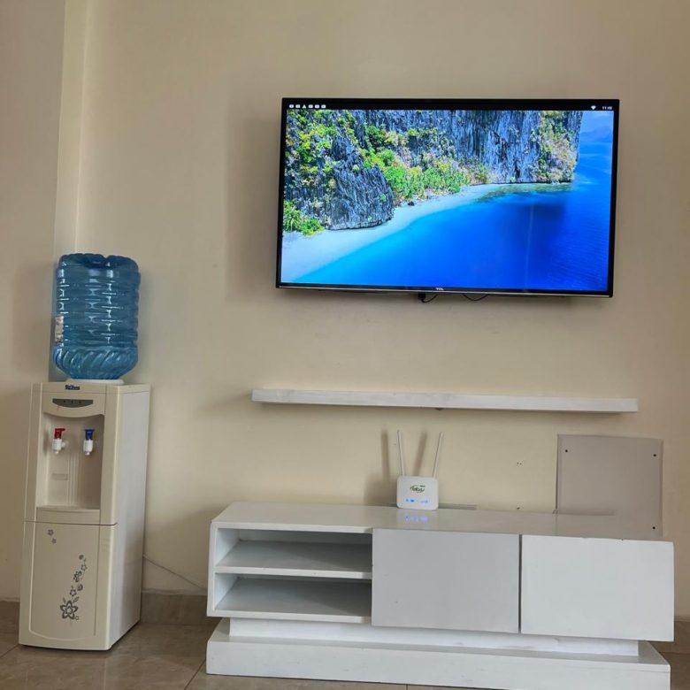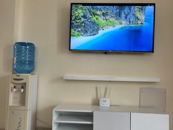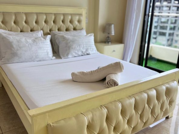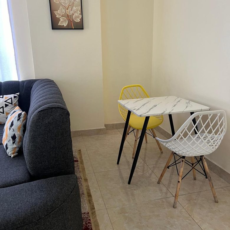 This cozy one-bedroom unit at 3rd Avenue Beach Apartments in Nyali offers a perfect blend of comfort and convenience. The open-plan living area is stylishly furnished, featuring a comfortable sofa and a flat-screen TV, creating a welcoming space for relaxation. Large windows allow natural light to fill the room, giving it an airy and bright atmosphere.