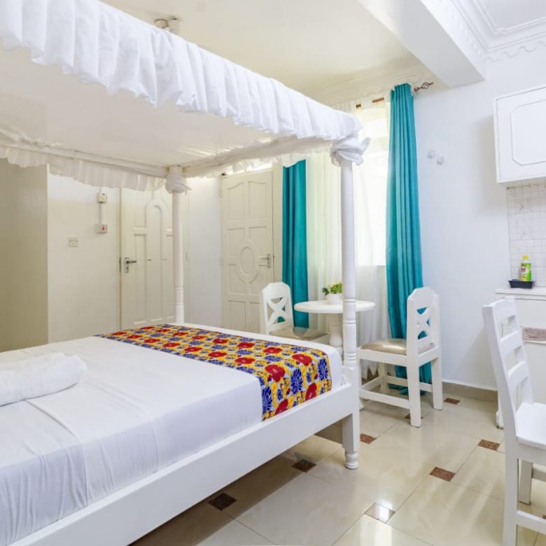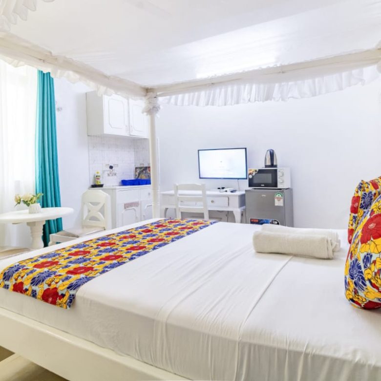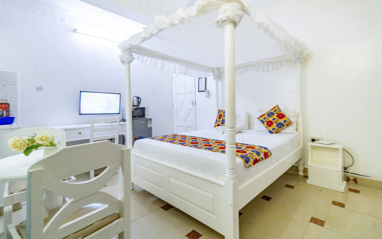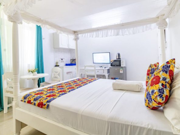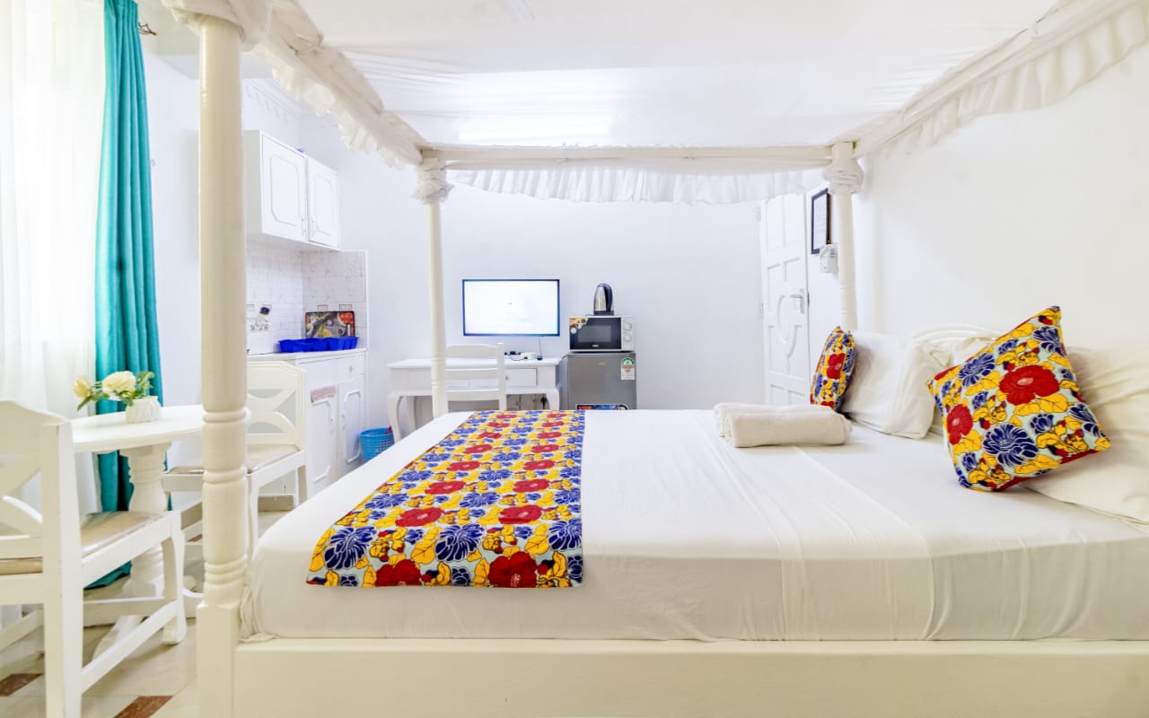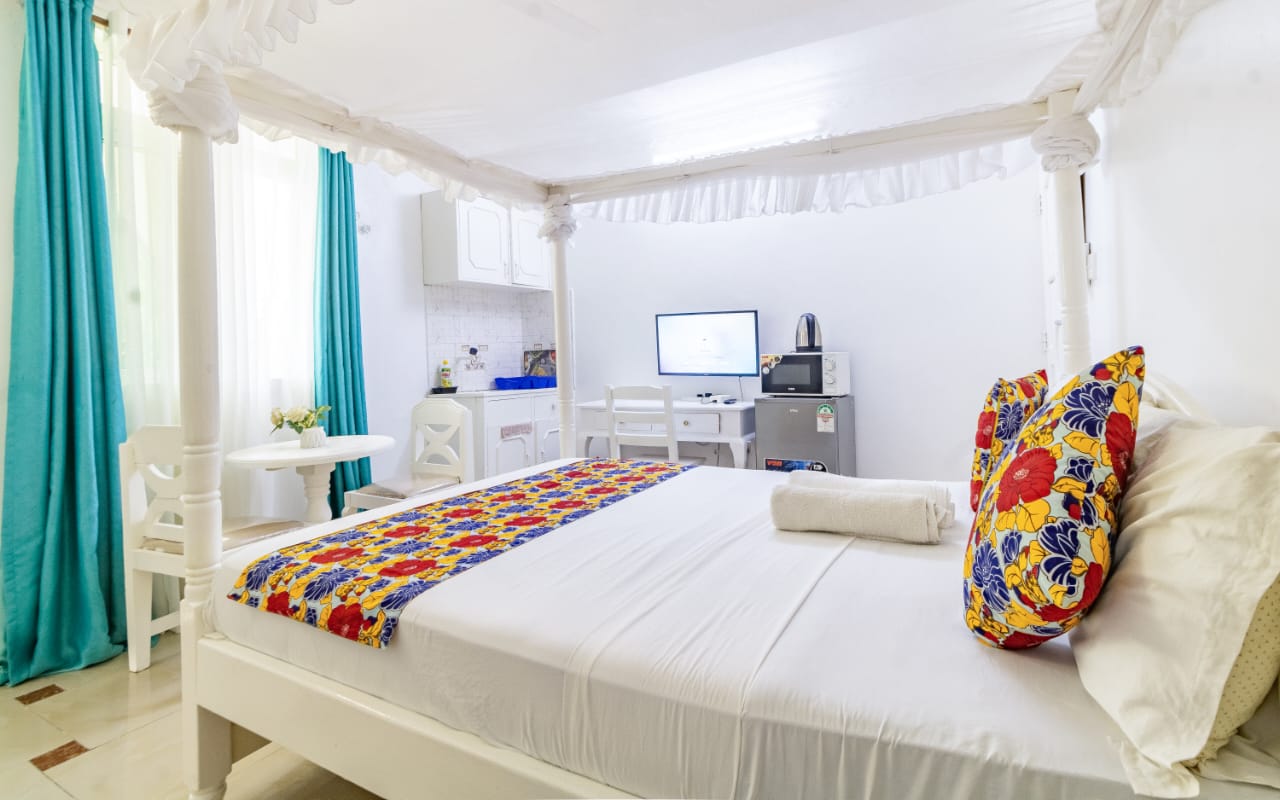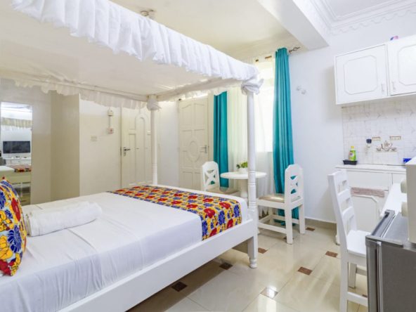 This fully furnished studio in Nyali is located just a 3-minute drive from Maasai Beach. It offers a cozy living space with a comfortable bed, a seating area with a flat-screen TV, and a kitchenette equipped with a refrigerator, microwave, and essential kitchenware. The studio also includes a private bathroom with complimentary toiletries, all complemented by modern decor. Additional amenities like free Wi-Fi and parking make it perfect for both short and long stays. (59)