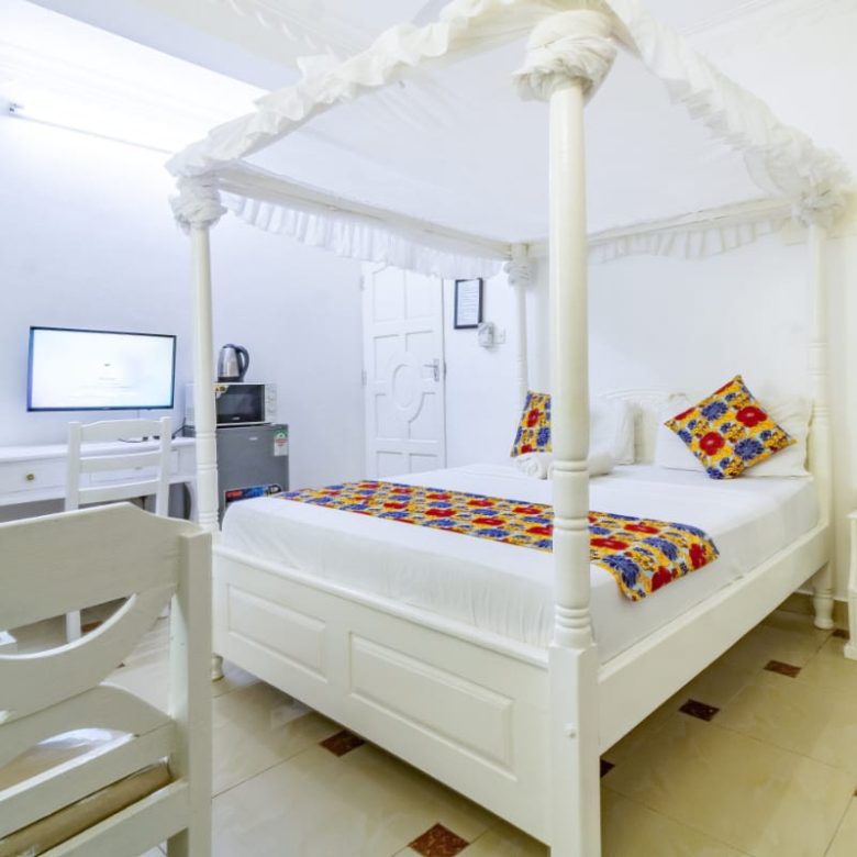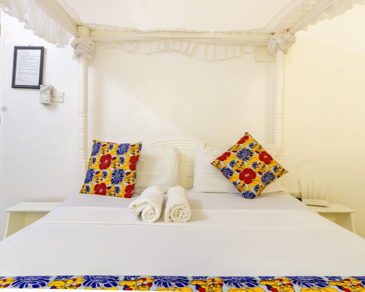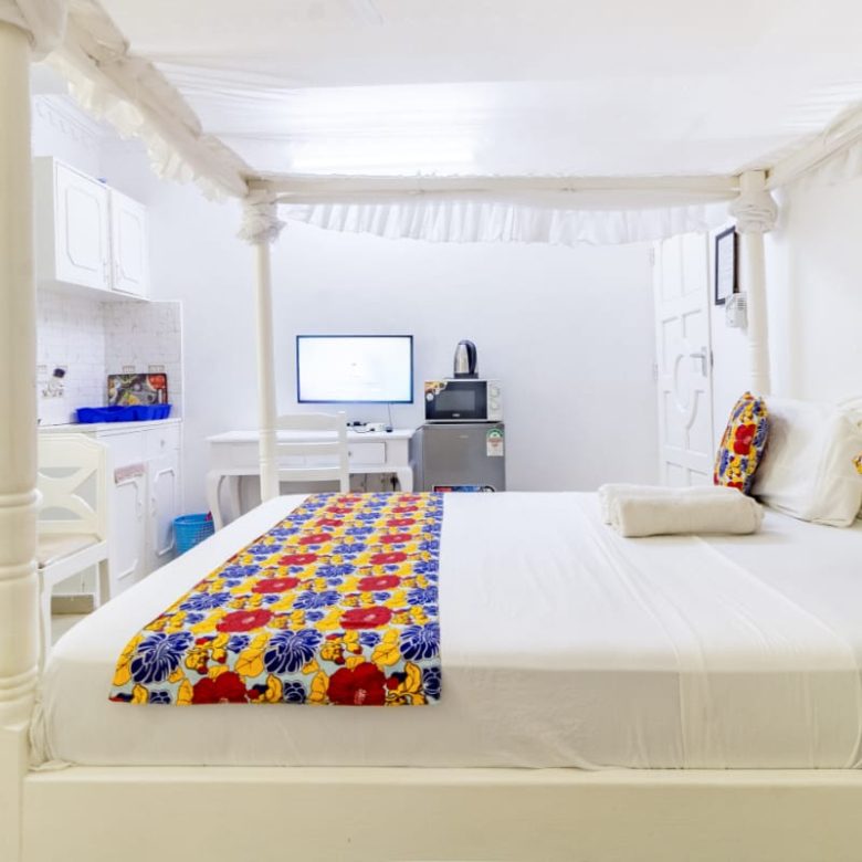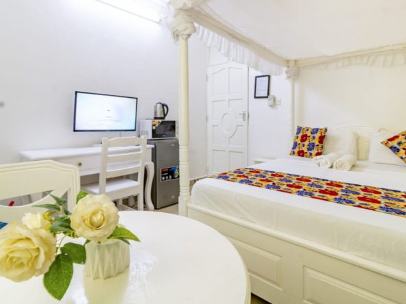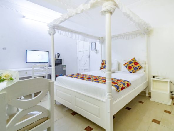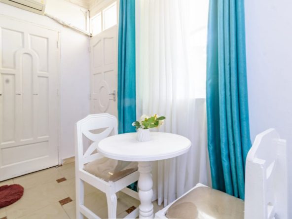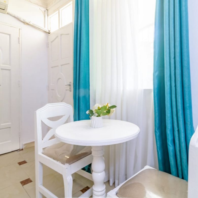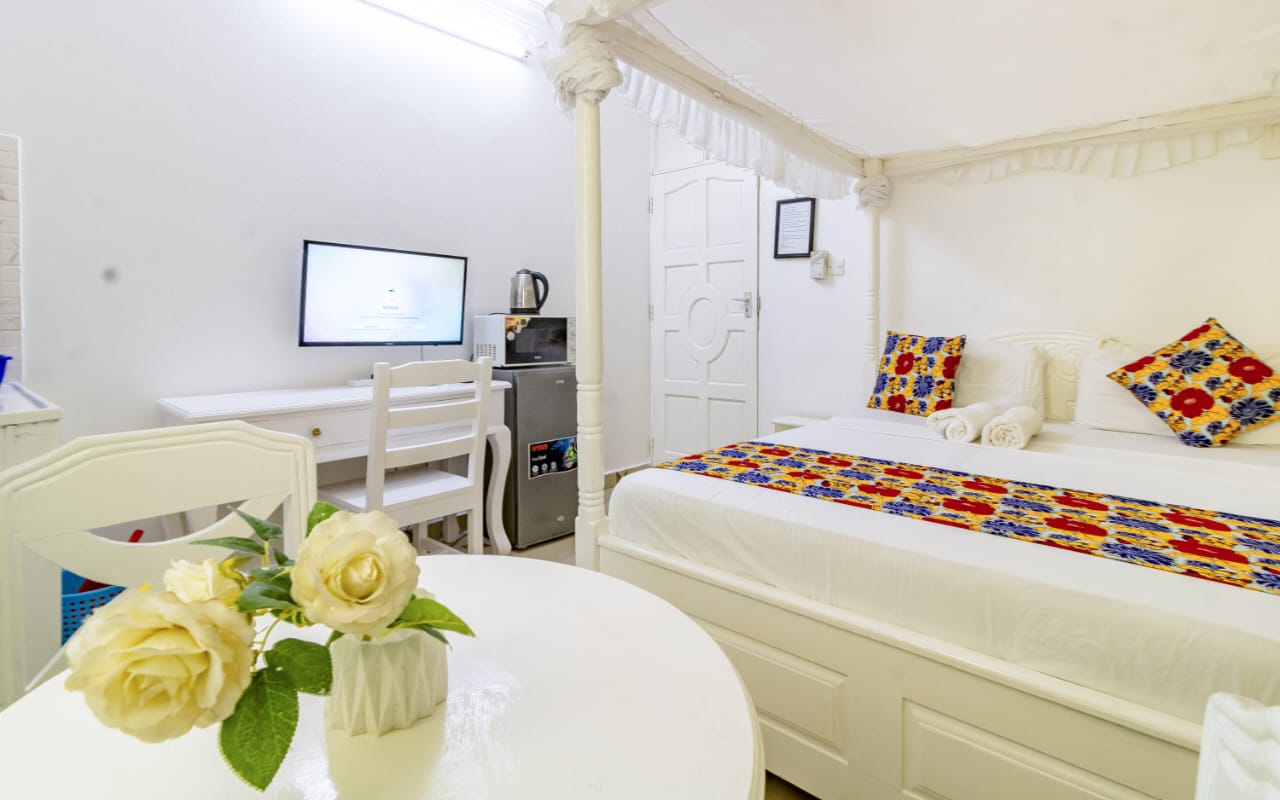 This fully furnished studio in Nyali is located just a 3-minute drive from Maasai Beach. It offers a cozy living space with a comfortable bed, a seating area with a flat-screen TV, and a kitchenette equipped with a refrigerator, microwave, and essential kitchenware. The studio also includes a private bathroom with complimentary toiletries, all complemented by modern decor. Additional amenities like free Wi-Fi and parking make it perfect for both short and long stays. (59)