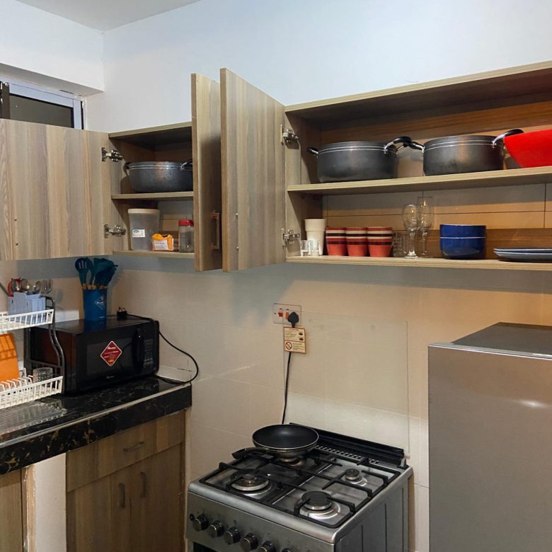 The bedroom is spacious with a comfortable bed and ample storage. The unit is located in a secure compound, providing peace of mind with 24/7 security. Perfect for those seeking a comfortable and safe space close to local amenities.