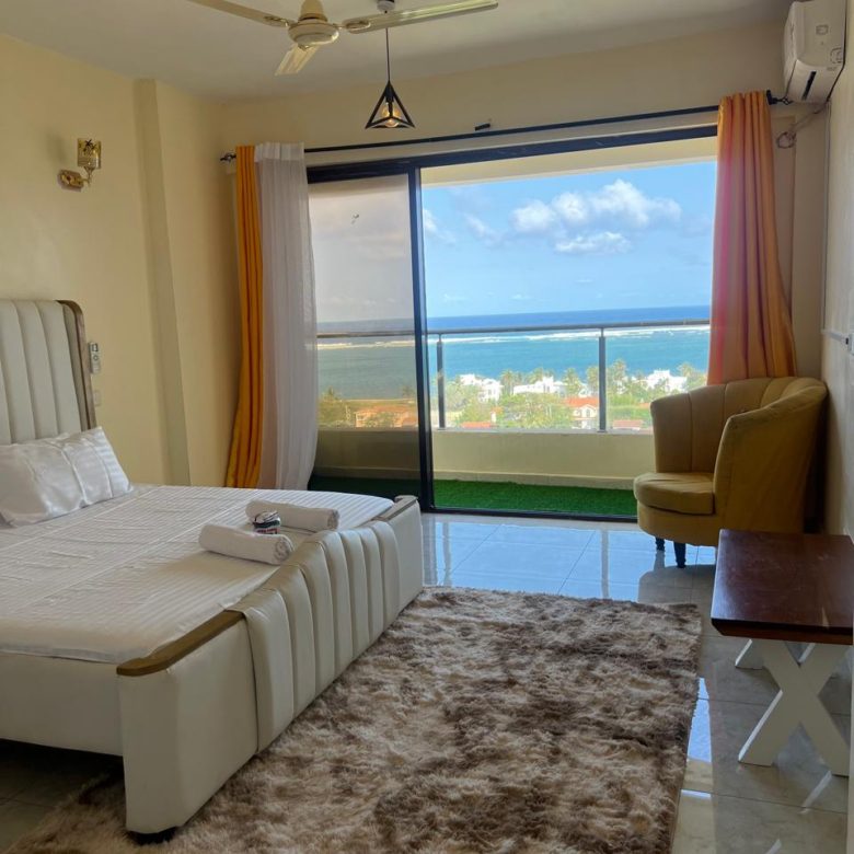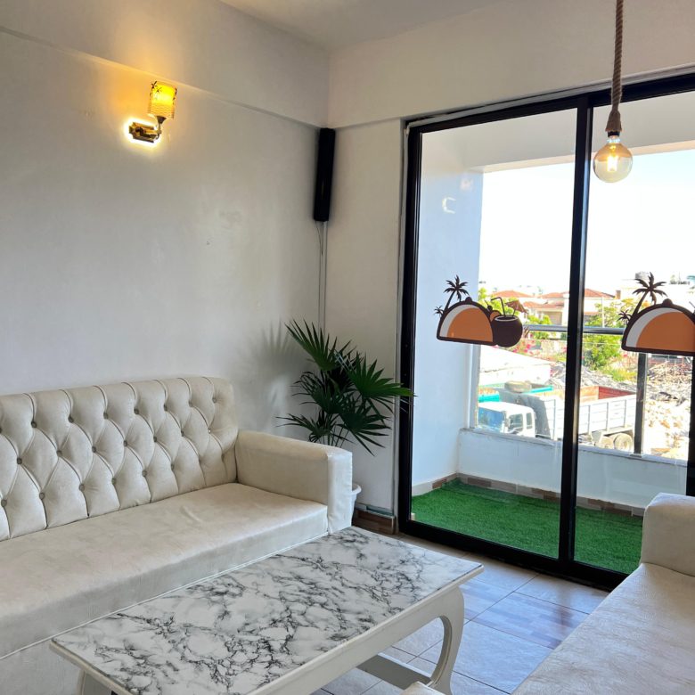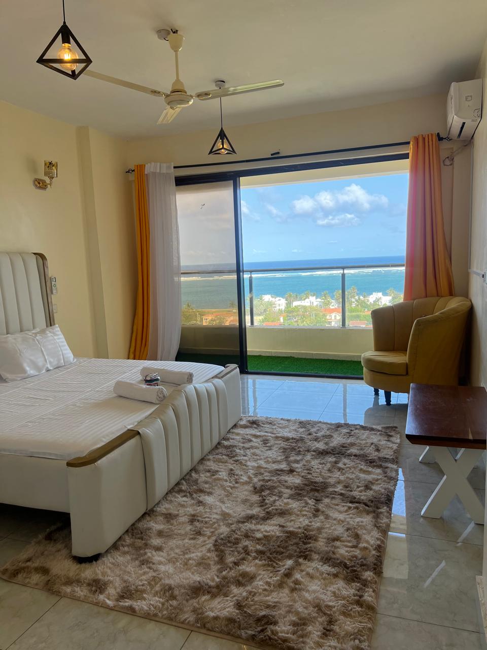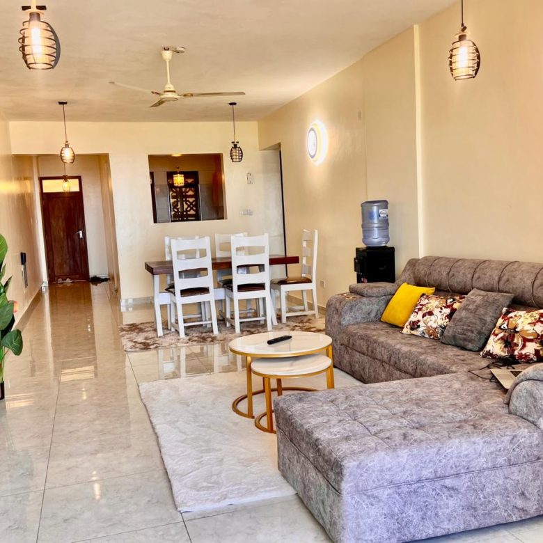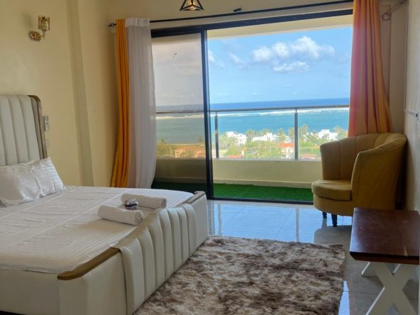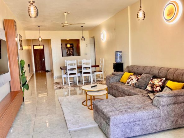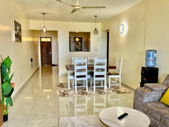 This fully furnished 2-bedroom apartment in Nyali, located on 3rd Avenue, boasts a breathtaking sea view.