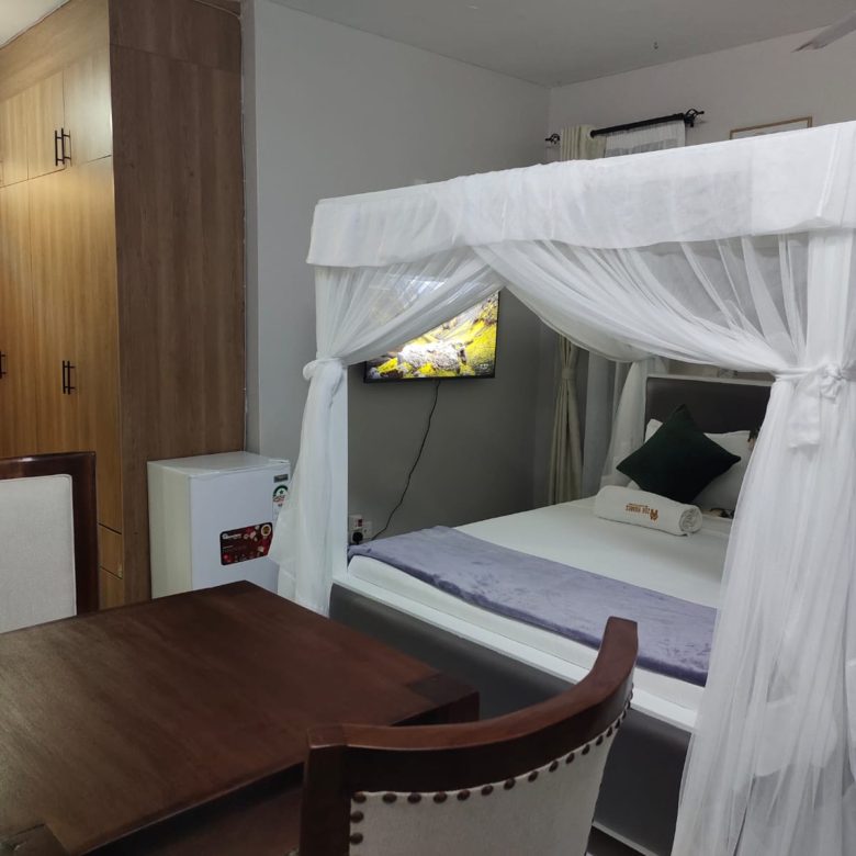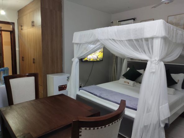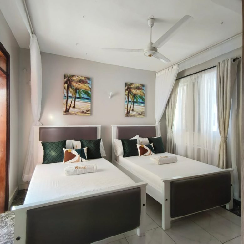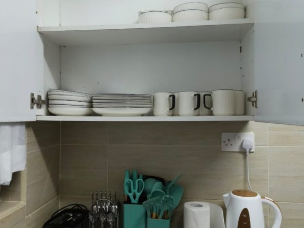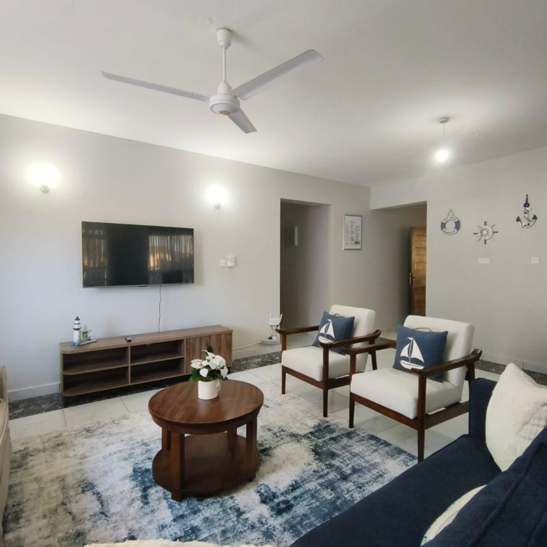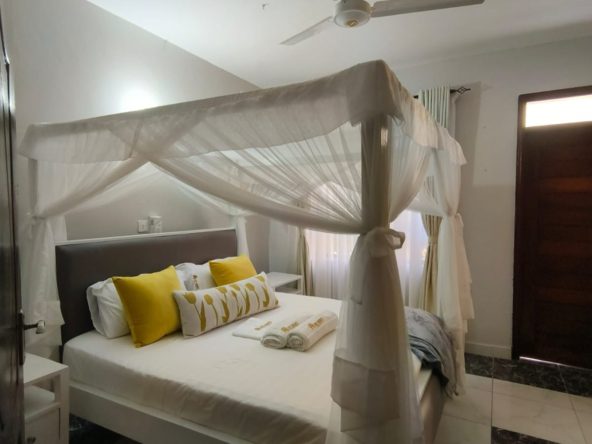 The three bedrooms are generously sized, each furnished with comfortable beds, stylish décor, and ample wardrobe space. The master bedroom has an en-suite bathroom for added privacy, while the other two bedrooms share a modern bathroom. All bedrooms are equipped with fans to ensure comfort on warmer days, providing a cool and restful environment.
