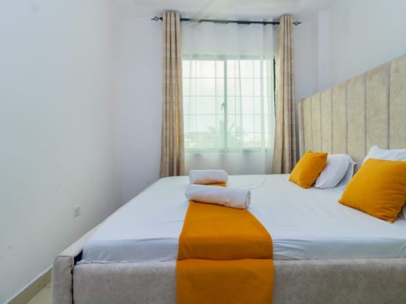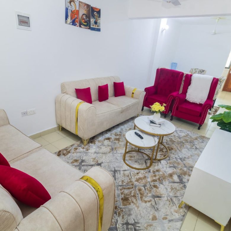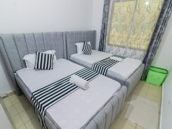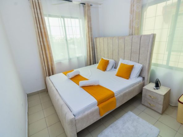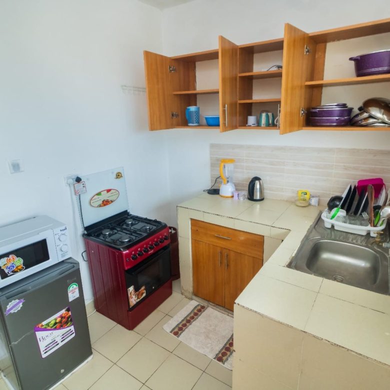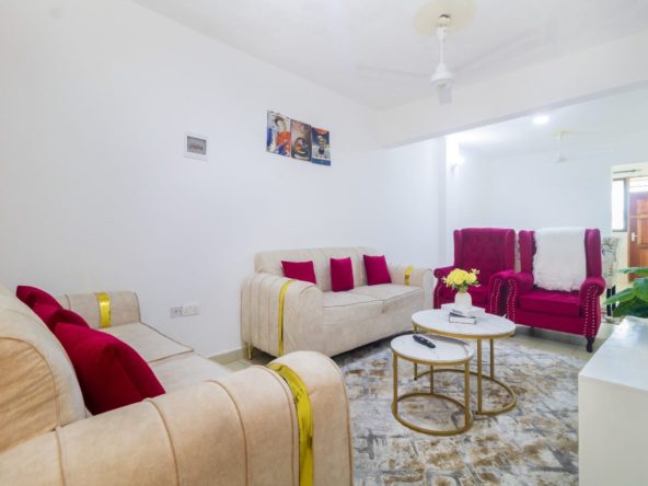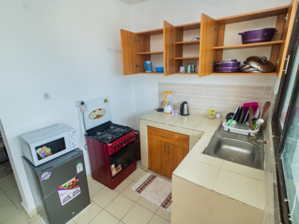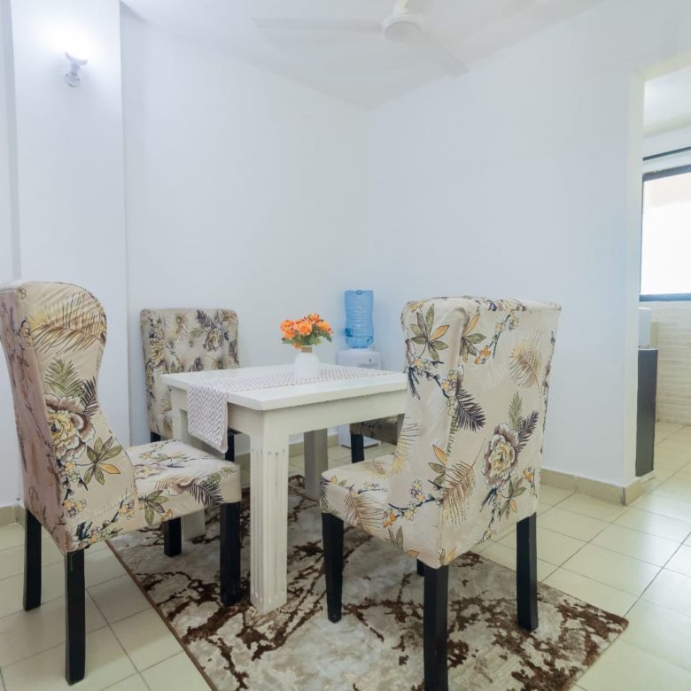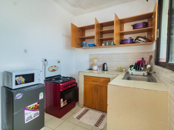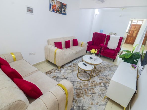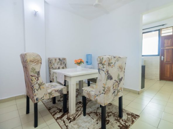 This two-bedroom unit in Bamburi Mwembeni offers a spacious and comfortable living space. The open-plan living area is bright and airy, featuring modern furniture and a cozy atmosphere.