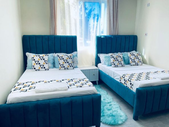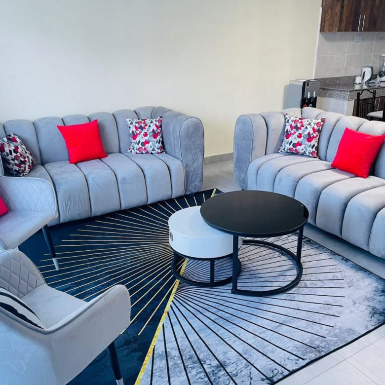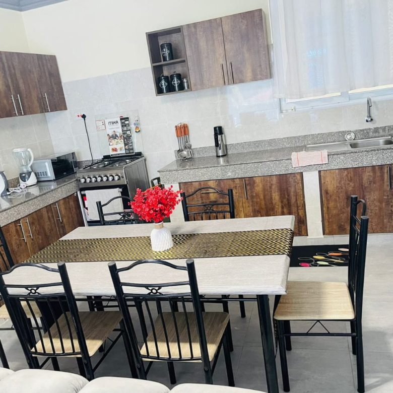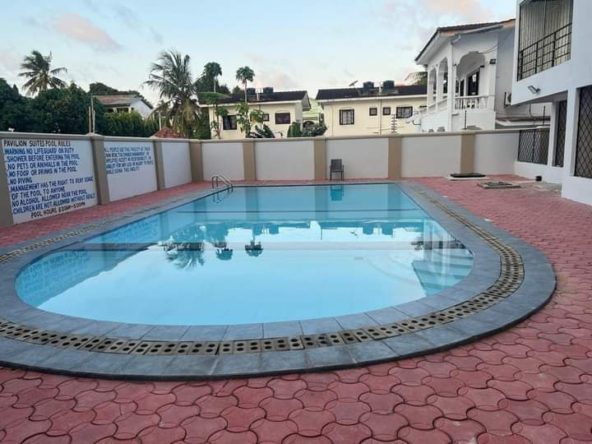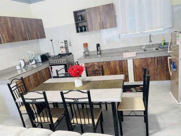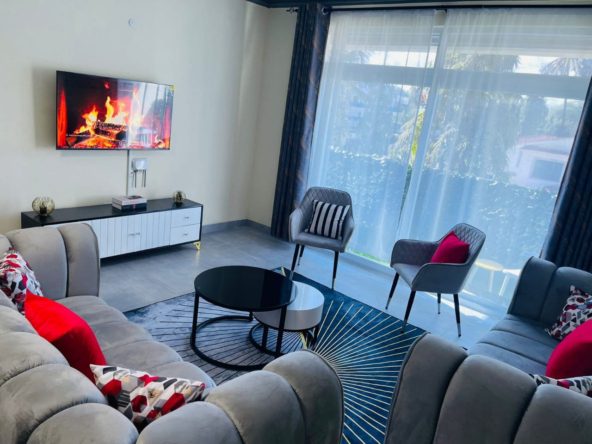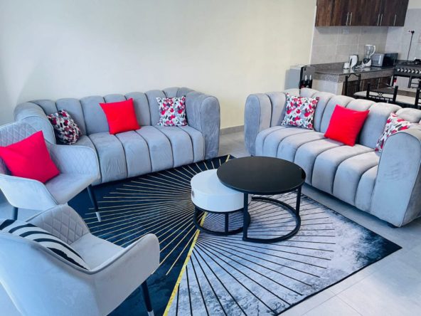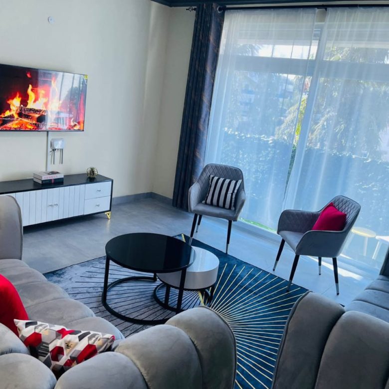 A stylish 3-bedroom unit located in Nyali Pavilion Suites, offering a blend of modern design and comfort. The spacious open-plan living and dining area is bright and airy, with large windows that allow plenty of natural light to fill the space.