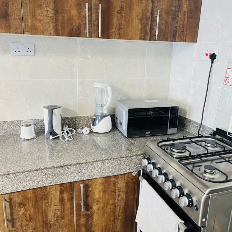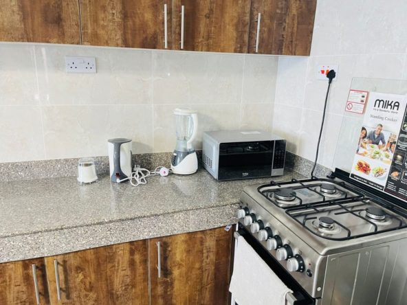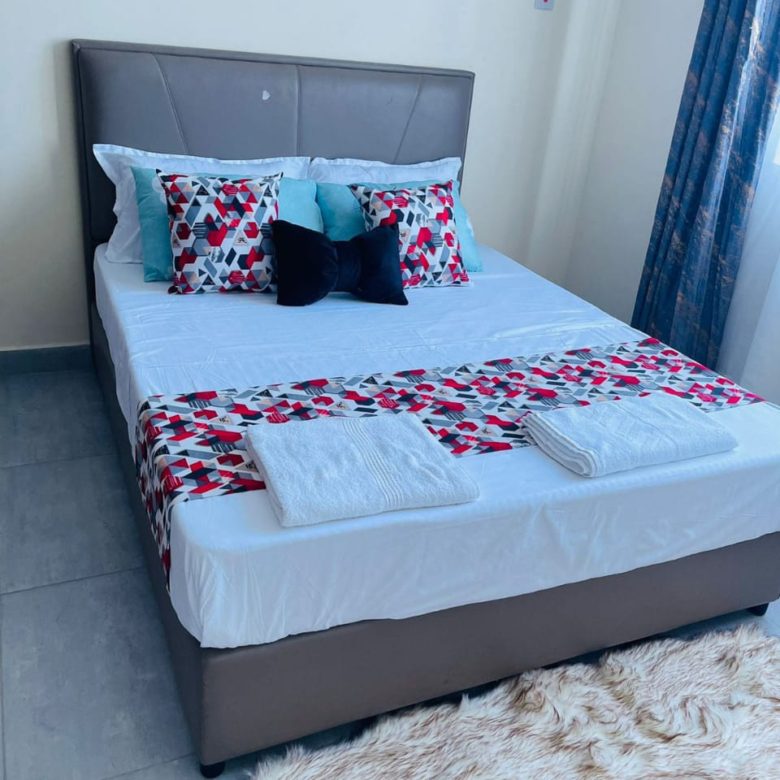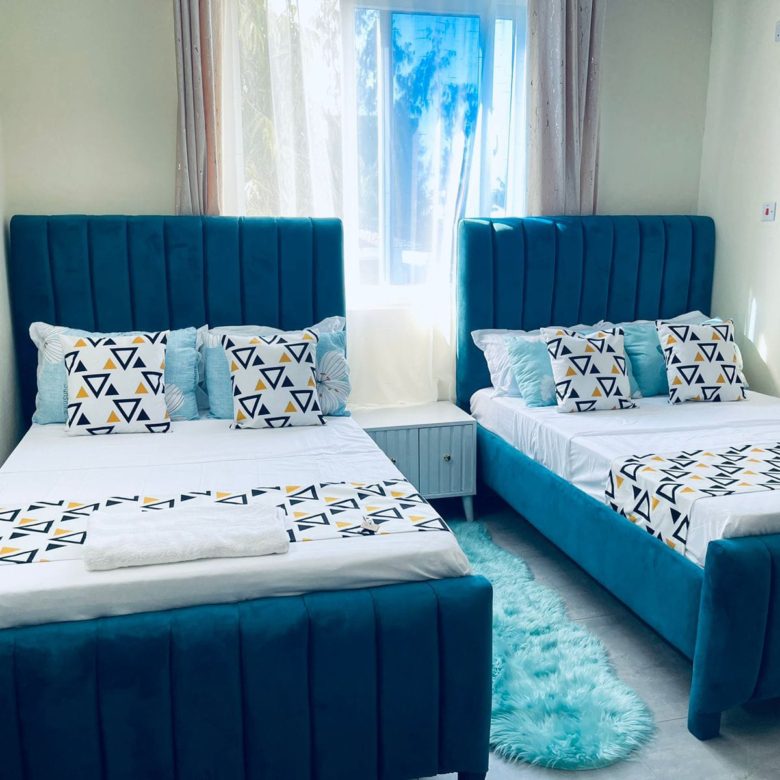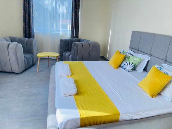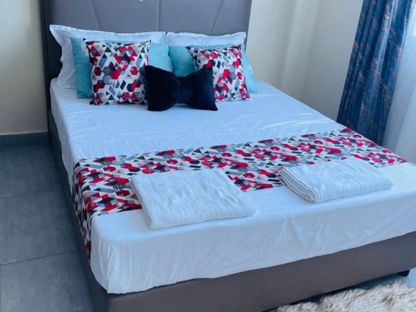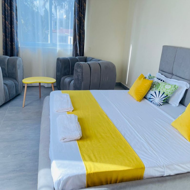 A stylish 3-bedroom unit located in Nyali Pavilion Suites, offering a blend of modern design and comfort. The spacious open-plan living and dining area is bright and airy, with large windows that allow plenty of natural light to fill the space.