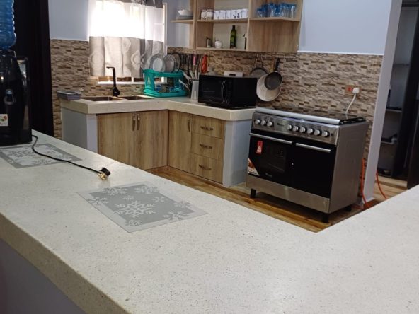 The kitchen is well-equipped with high-end appliances, including a stove, refrigerator, microwave, and ample counter space, making it perfect for home cooking. Each of the three bedrooms is generously sized, furnished with comfortable beds, and offers plenty of storage space. The master bedroom features an en-suite bathroom for added privacy.