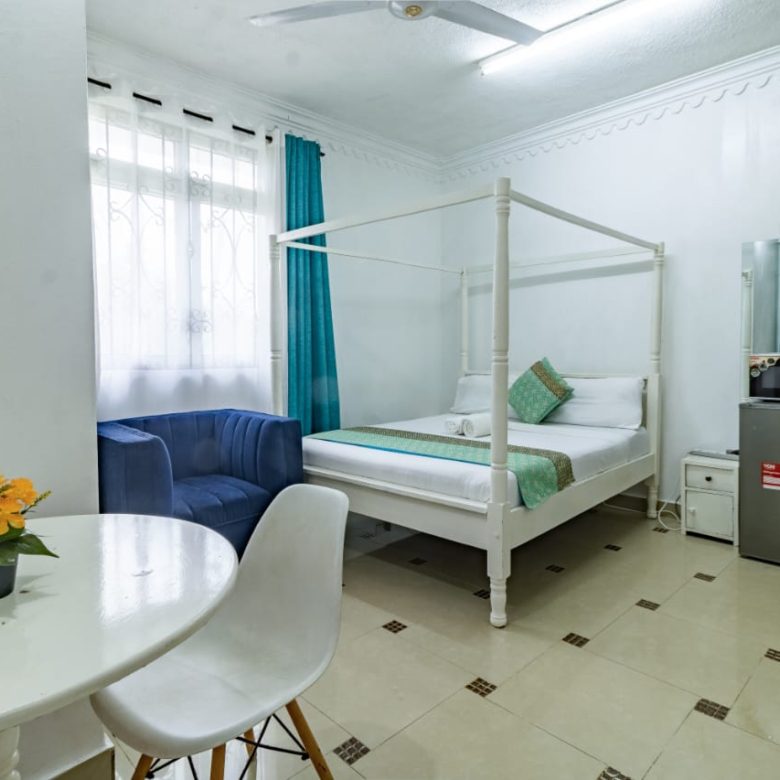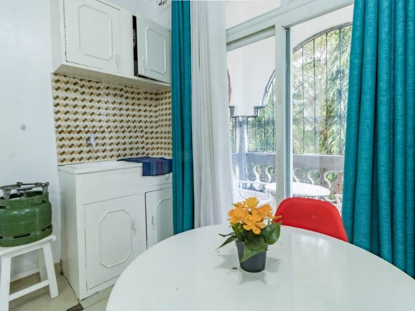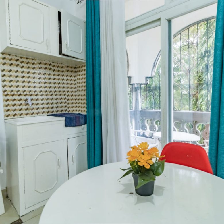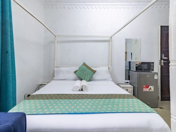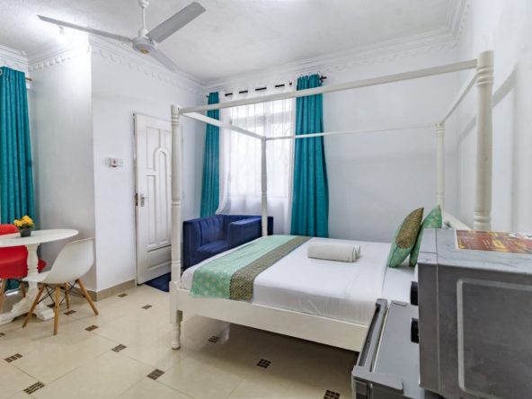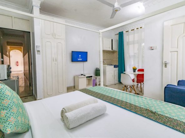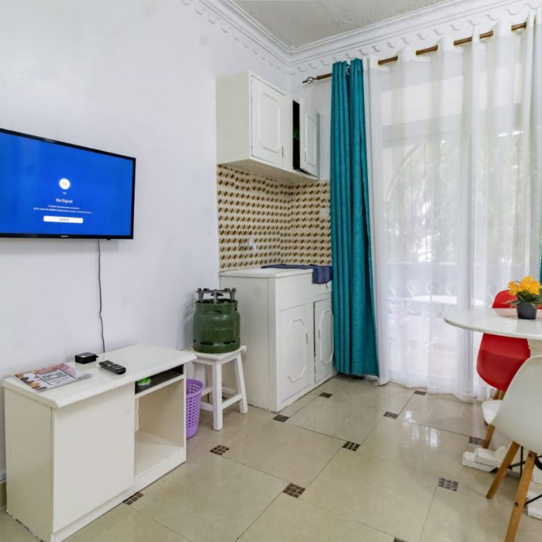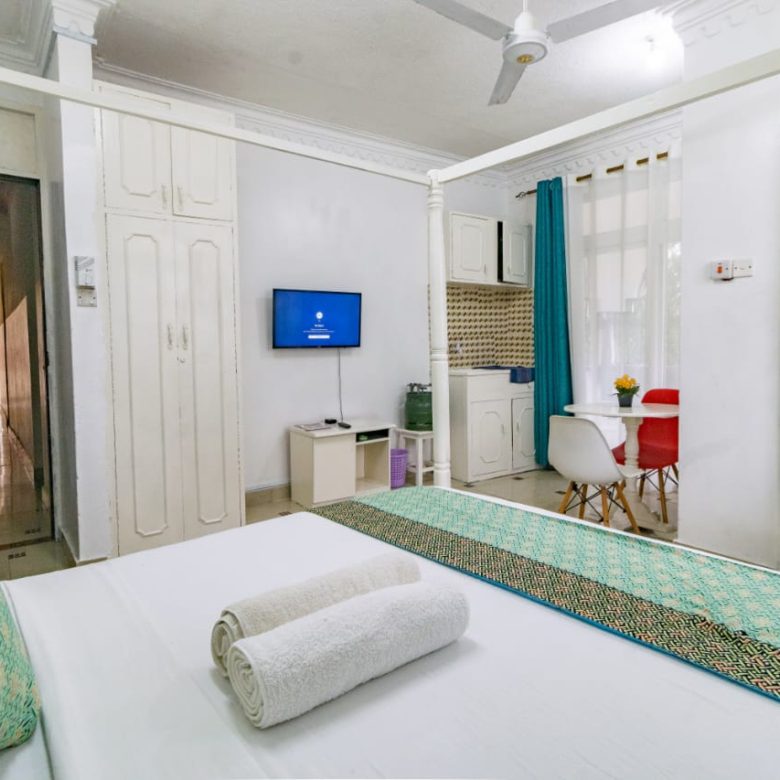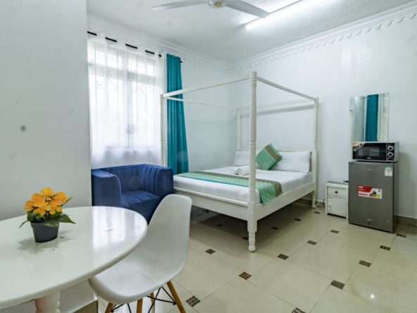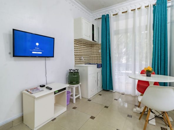 This fully furnished studio in Nyali, just a 3-minute drive from Maasai Beach, offers a modern and comfortable space. It features a cozy bed, a seating area with a flat-screen TV, and a kitchenette with a refrigerator, microwave, and essential kitchenware. The studio also includes a private bathroom with toiletries and is decorated in a contemporary style. With amenities like free Wi-Fi and parking, it’s an ideal choice for both short and extended stays.