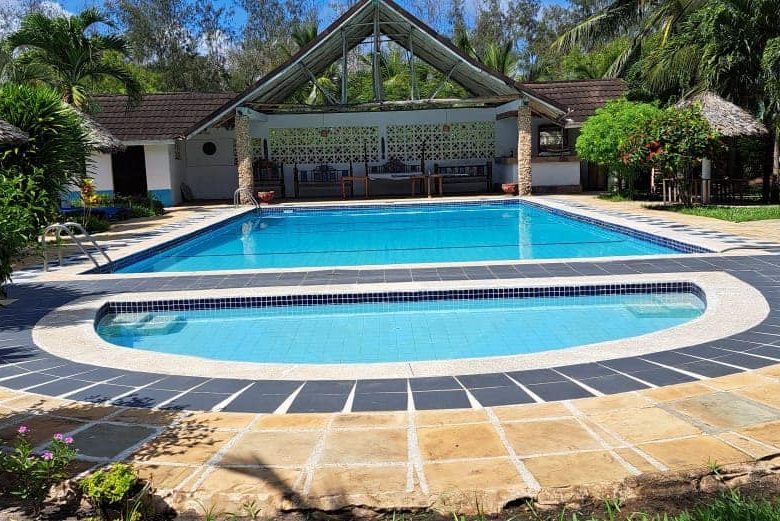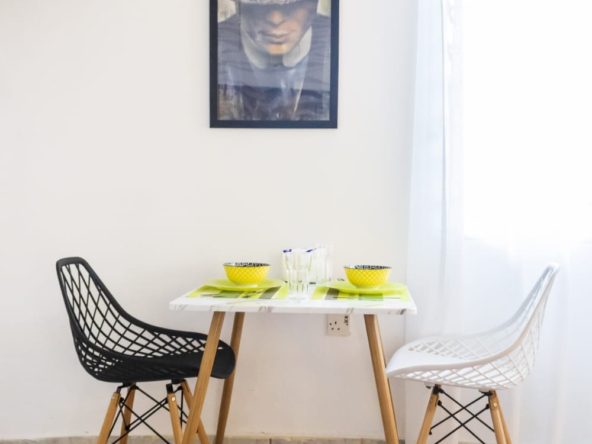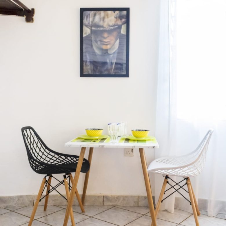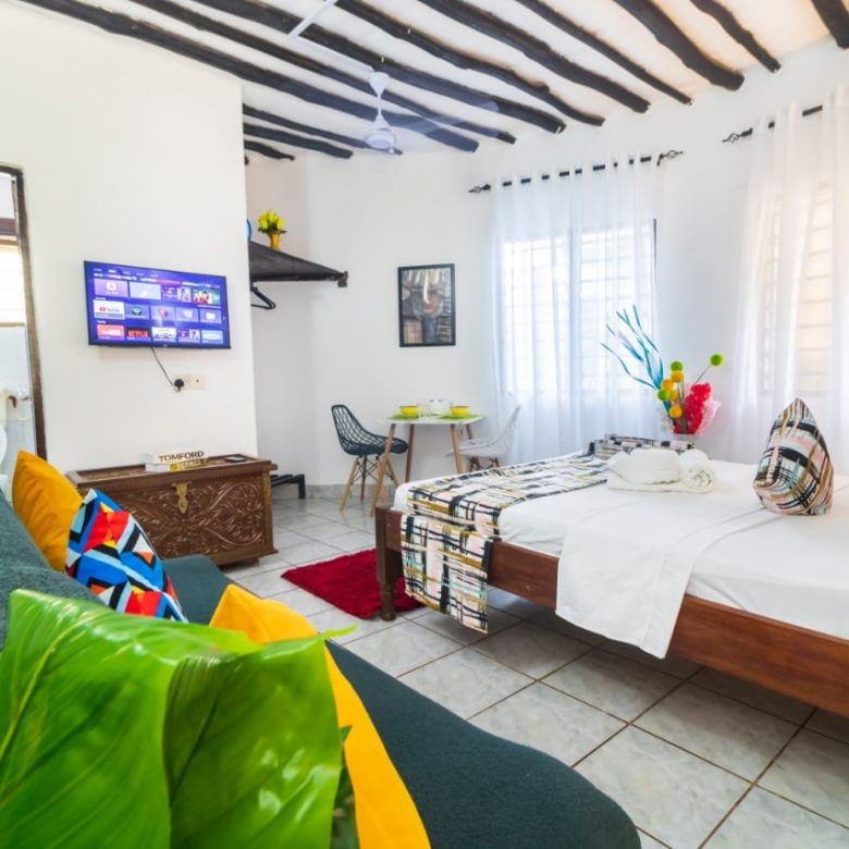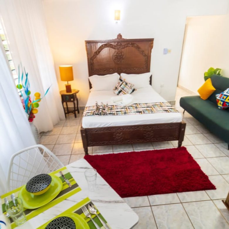 This charming studio unit at Southern Cottage in Diani offers a cozy and convenient living space, perfect for a beach getaway. The open-plan layout features modern furnishings, including a comfortable bed, small dining area, and kitchenette with essential appliances. The well-maintained bathroom includes a shower and basic fixtures.