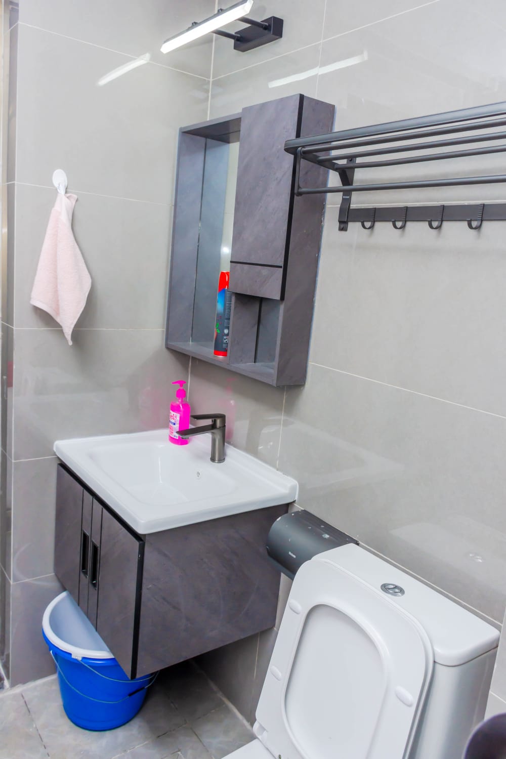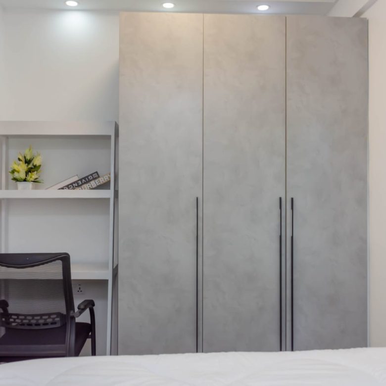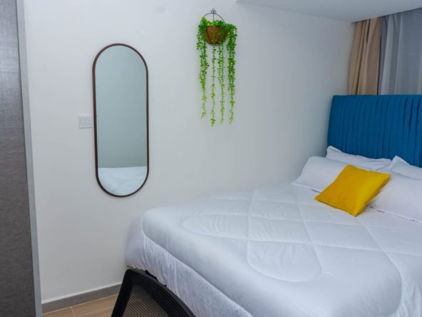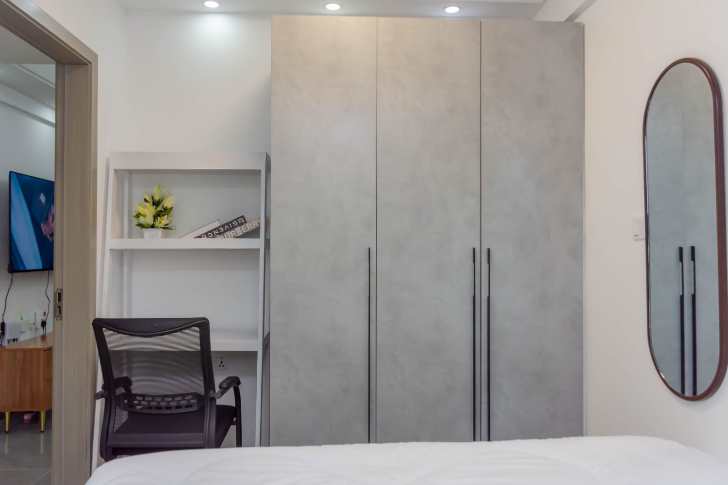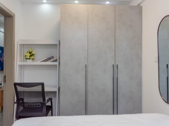 The bedroom is a peaceful sanctuary, featuring a comfortable bed with quality linens and stylish furnishings. The ample wardrobe space ensures all your clothing is neatly organized, while the room’s soft lighting creates a calming environment perfect for unwinding after a long day.